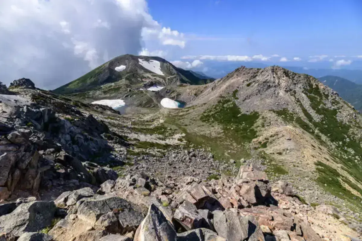 ■ 所在地︰石川県・岐阜県■ 標高: 2,702m■ 特徴: 北陸のシンボルであり、富士山・立山と並ぶ「日本三霊山」の一つ。■ 歴史と信仰︰奈良時代の僧・泰澄(たいちょう)が開山したと伝えられ、命の源である「水」を司る神として崇められてきました。全国に広がる白山神社の総本宮、白山比咩(しらやまひめ)神社は今も厚い信仰を集めています。■ 登山の魅力︰「花の白山」と呼ばれるほど高山植物が豊富で、夏には天上の楽園のような景色が広がります。山頂の「お池巡り」では、火山活動が作り出した神秘的な火口湖を望むことができます。